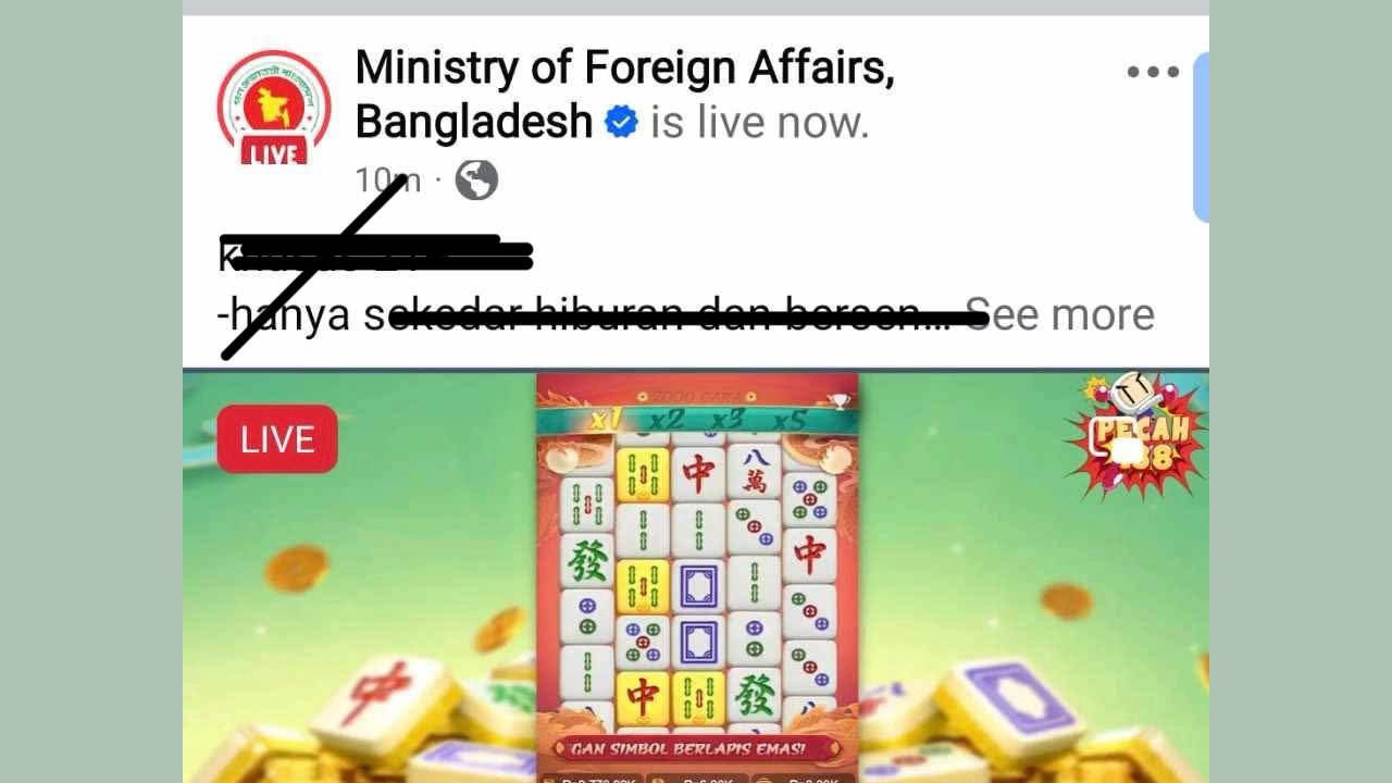 জানা গেছে, ইন্দোনেশিয়ার হ্যাকাররা মন্ত্রণালয়ের ফেসবুক পেজ হ্যাক করে। পেজটি তাদের নিয়ন্ত্রণে নিয়ে সেখান থেকে তারা জুয়ার লাইভ প্রচার চালায়। পরে রাত সাড়ে ৮টার দিকে পেজটি বন্ধ করে দেওয়া হয়।
