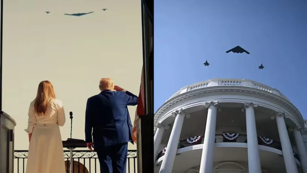 ফার্স্ট লেডি মেলানিয়া ট্রাম্পের পাশে দাঁড়িয়ে ট্রাম্প হোয়াইট হাউসের বারান্দা থেকে দুটি বি-২ বোমারু বিমানের স্যালুট গ্রহণ করেন। বোম্বারের পাশে এফ-৩৫ ও এফ-২২ যুদ্ধবিমানের গর্জন বিশেষ আবহ তৈরি করে।