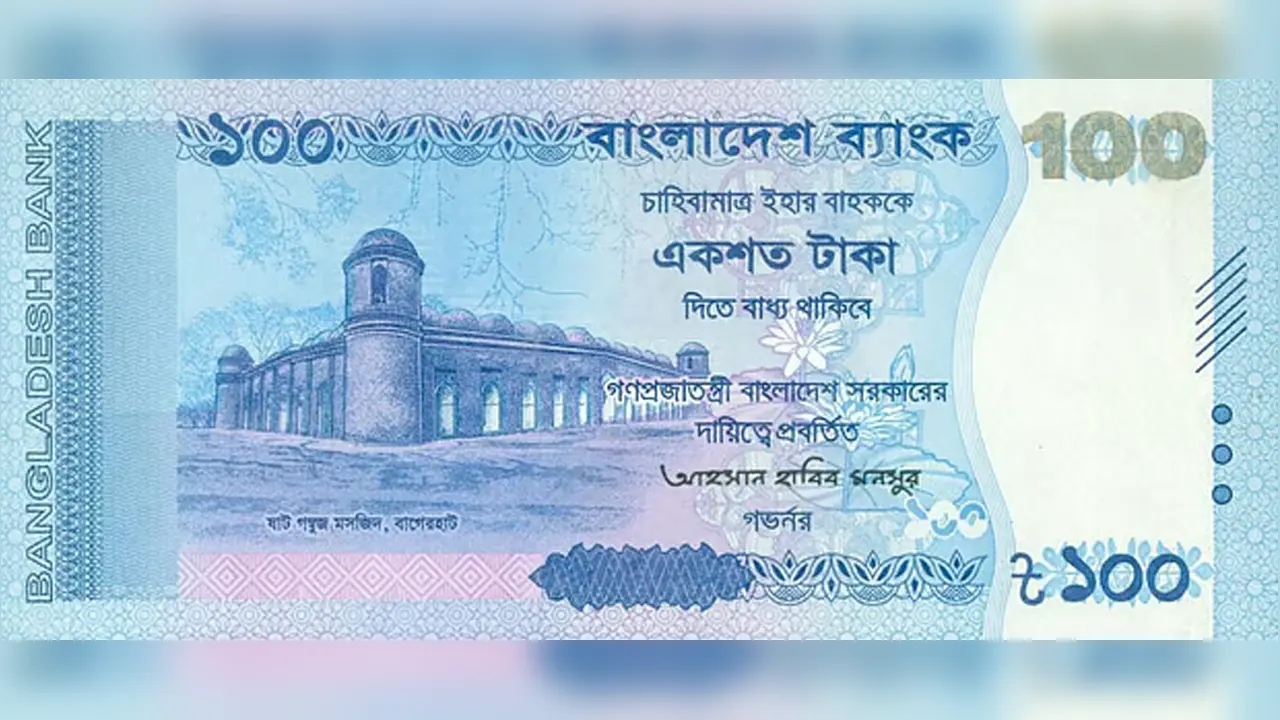 দৃশ্যপটেও এসেছে বদল। নতুন ১০০ টাকার নোটের সামনের অংশে বামপাশে রয়েছে ঐতিহাসিক ষাট গম্বুজ মসজিদের ছবি, মাঝখানে পাতা ও কলিসহ প্রস্ফুটিত শাপলা, আর পেছনে সুন্দরবনের মনোমুগ্ধকর দৃশ্য। জলছাপে যুক্ত হয়েছে রয়েল বেঙ্গল টাইগারের মুখ, যা নোটে বাড়তি সৌন্দর্যের সঙ্গে দিয়েছে নিরাপত্তার নিশ্চয়তা।