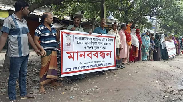 মানববন্ধনে এলাকাবাসী সাংবাদিক মনির বিরুদ্ধে মিথ্যা মামলা প্রত্যাহার করে